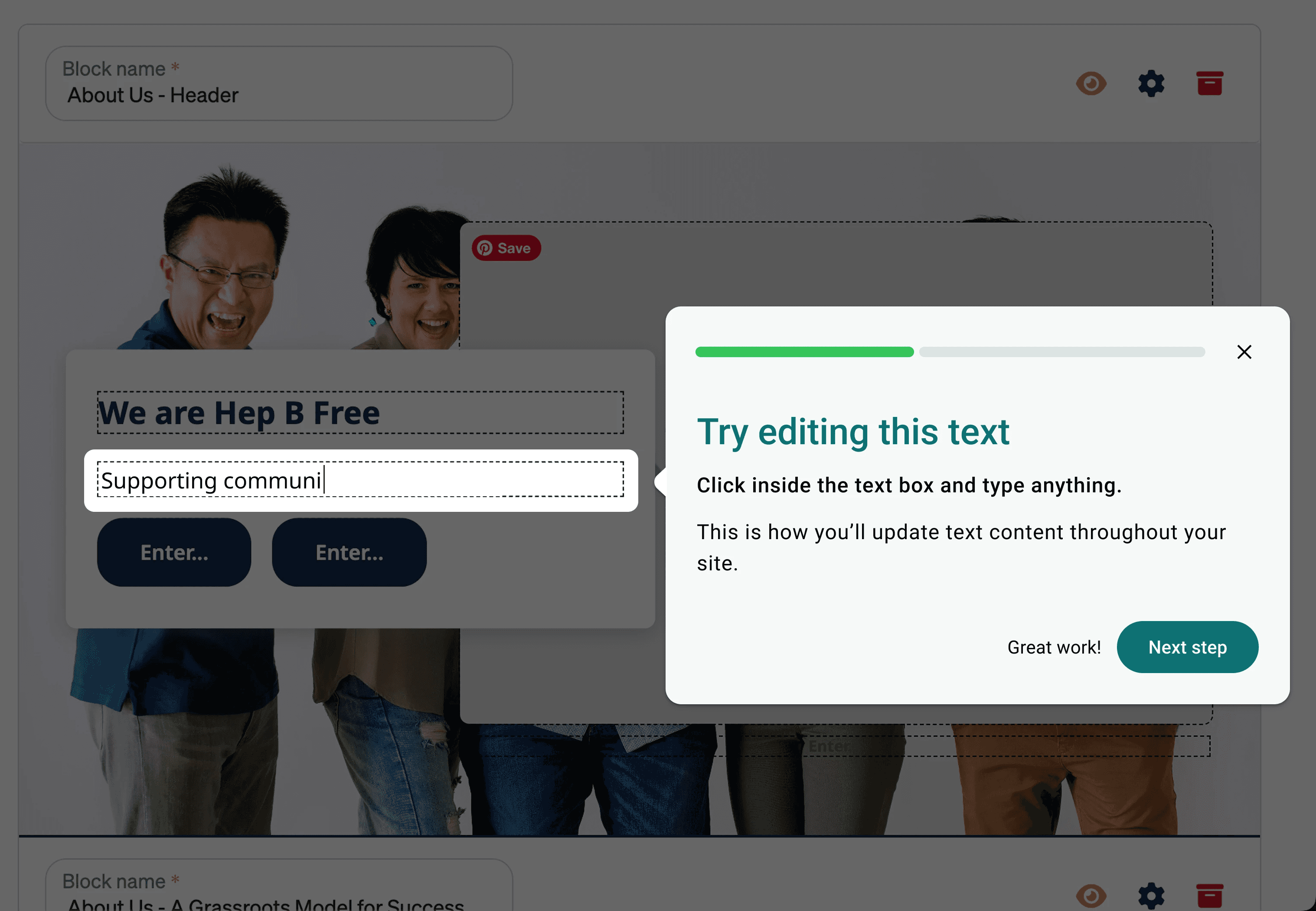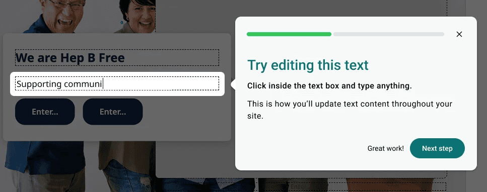 In-page guidance allows users to learn the website builder by making changes in real time, rather than following instructions in a separate window.