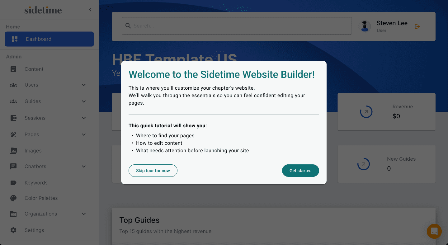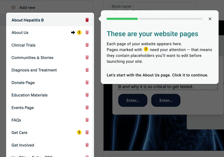 This feature provides step-by-step guidance directly within the website builder, so users can follow along as they make changes instead of referencing a separate guide. It helps reduce confusion and keeps setup moving forward.