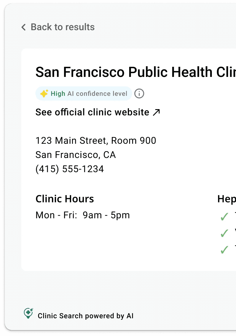 AI confidence score builds confidence and trust in feature and links to official clinic sources for further detail verification.