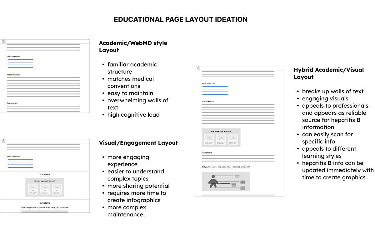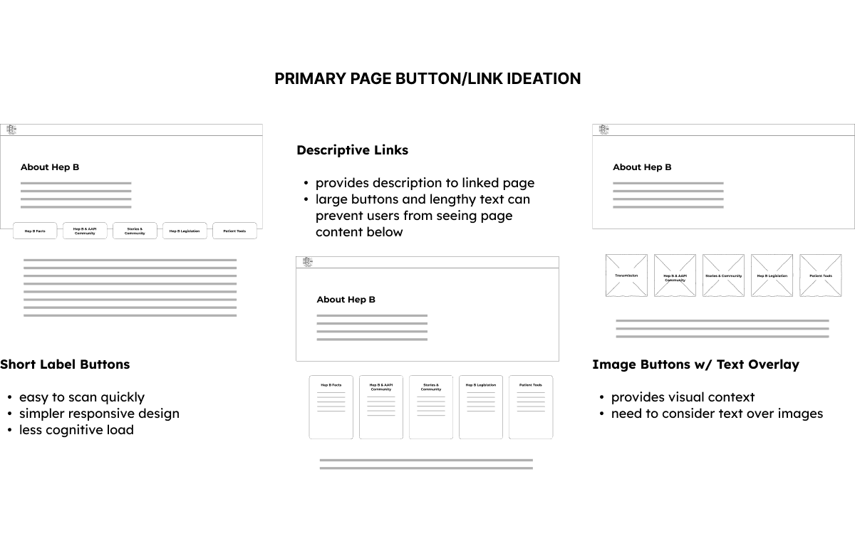 Focusing on these principles, I brainstormed website solutions, weighing pros and cons with my client to iterate and refine the best fit for project goals and user needs. Here are some ideas we explored: