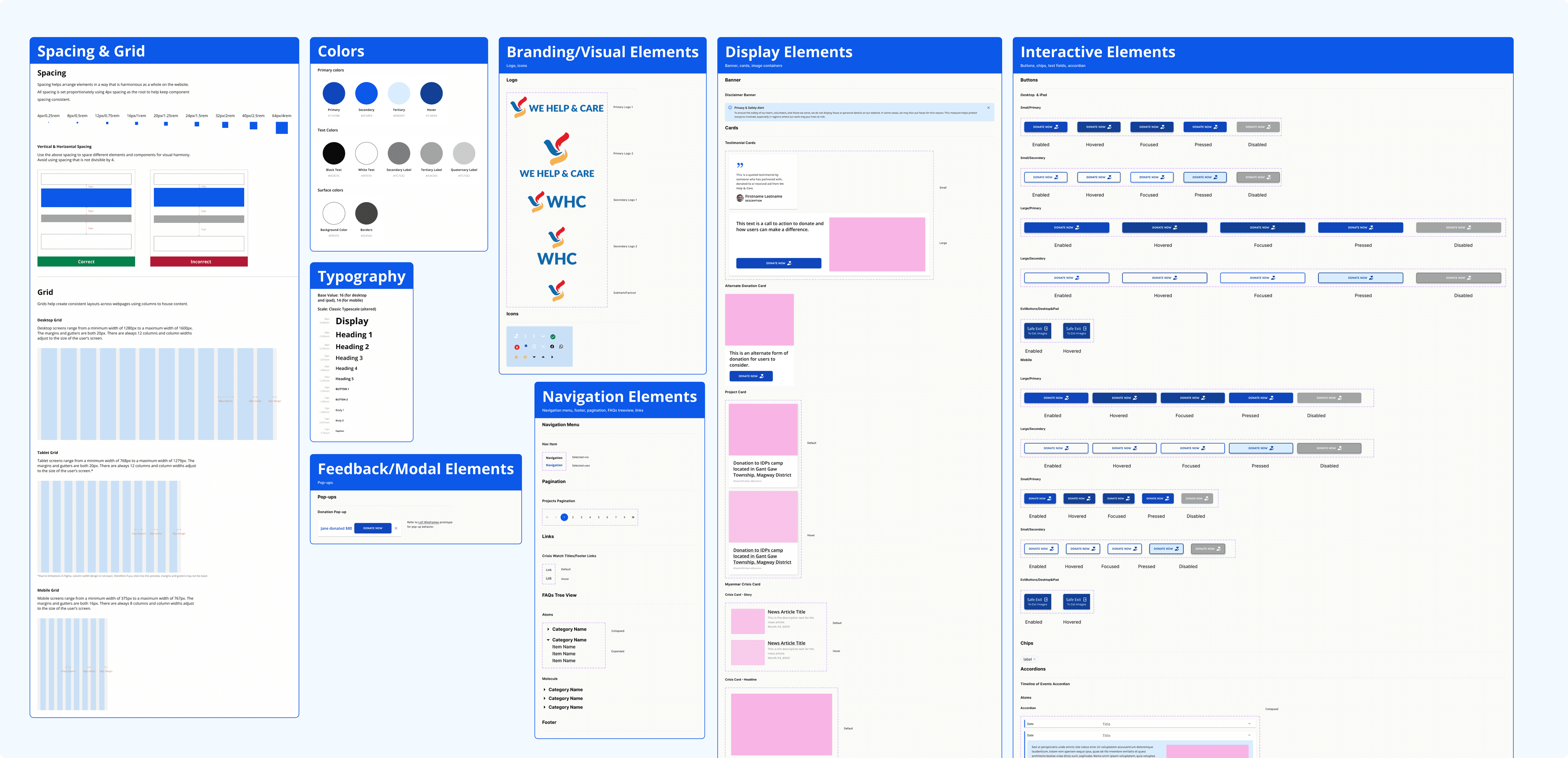 In preparation for the High-fidelity wireframes we created Brand Guidelines and a UI Design System. It was clear from our competitive analysis that what we needed was strong, consistent branding to deliver our message and inspire people to support WHC’s cause. I led the branding workshop for the design team and we came up with a set of branding guidelines and a UI design system.
