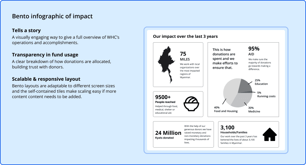 Despite our communication challenges, our team successfully delivered a detailed redesign proposal that addresses the clients’ goals and key user issues. The proposed redesign includes clear and consistent messaging and a more engaging user experience aimed at increasing donations and broadening WHC's reach. Our work provides WHC with a strong foundation to move forward with their website redesign — they can more effectively communicate their mission and raise the necessary funds to continue their work in Myanmar.