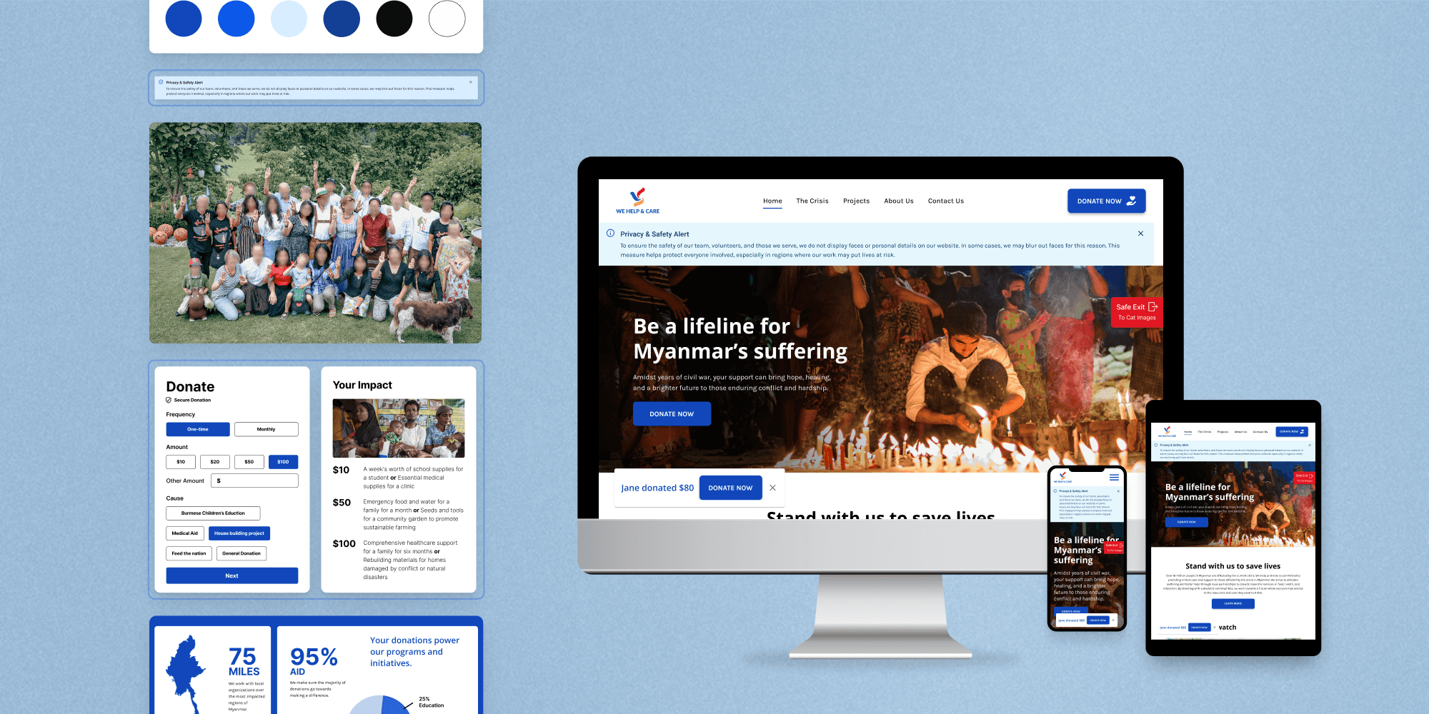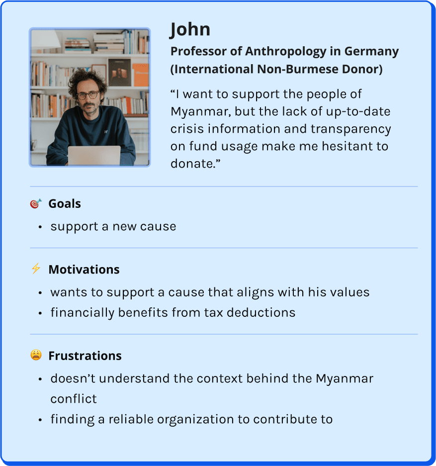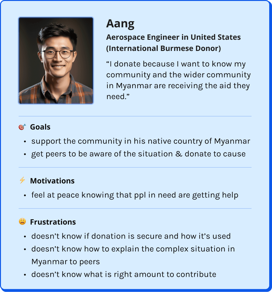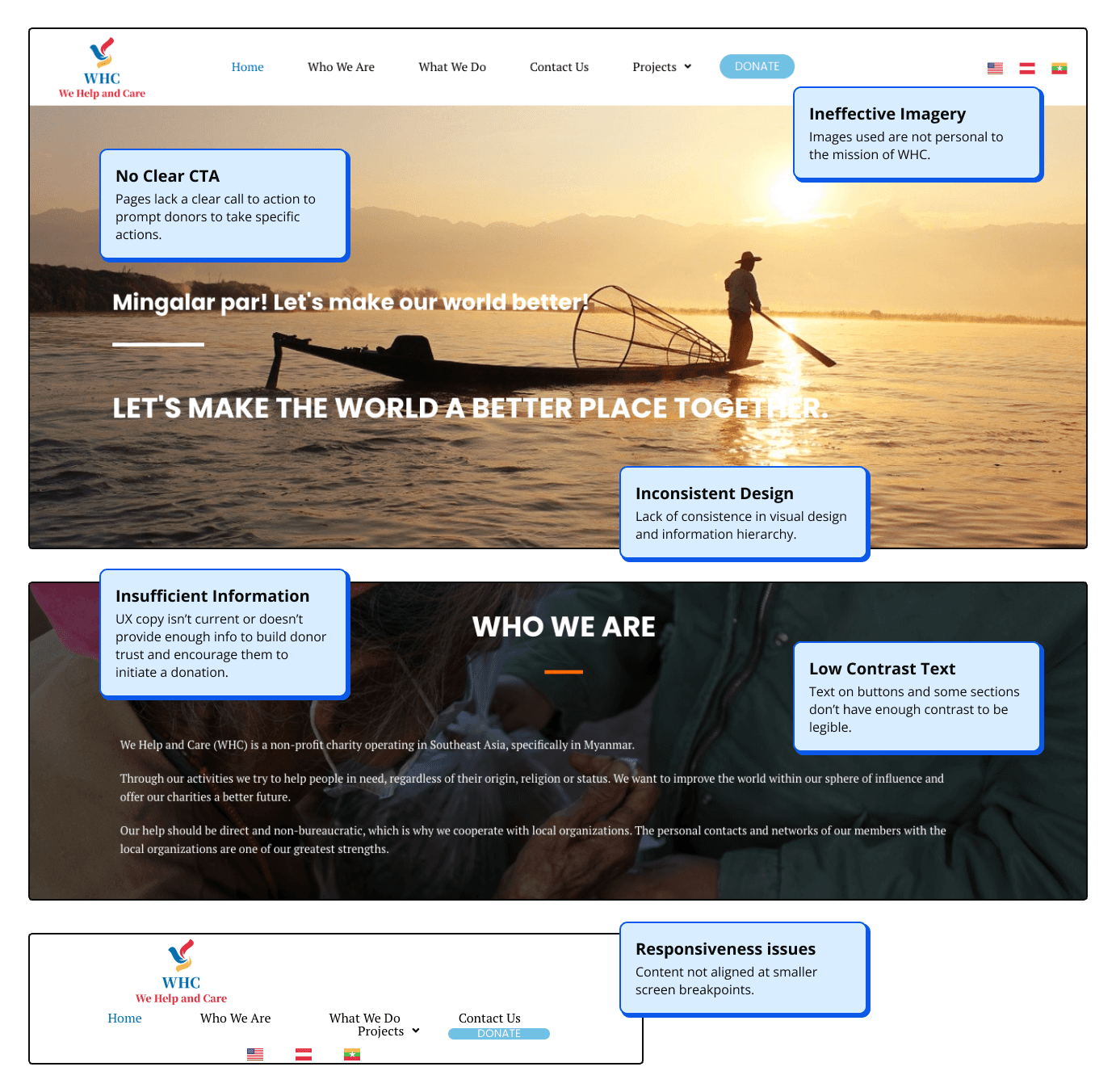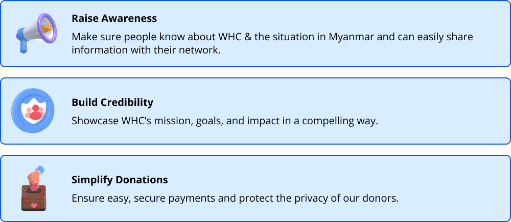 We Help & Care (WHC) is a non-profit humanitarian aid organization that aids those in need in Myanmar, including those displaced by the Myanmar Crisis. Their main source of funding is from direct solicitation from friends, family, and local businesses. WHC's existing website was failing to generate online donations. From our research, we found that WHC’s main problem was garnering trust and transparency from visitors.