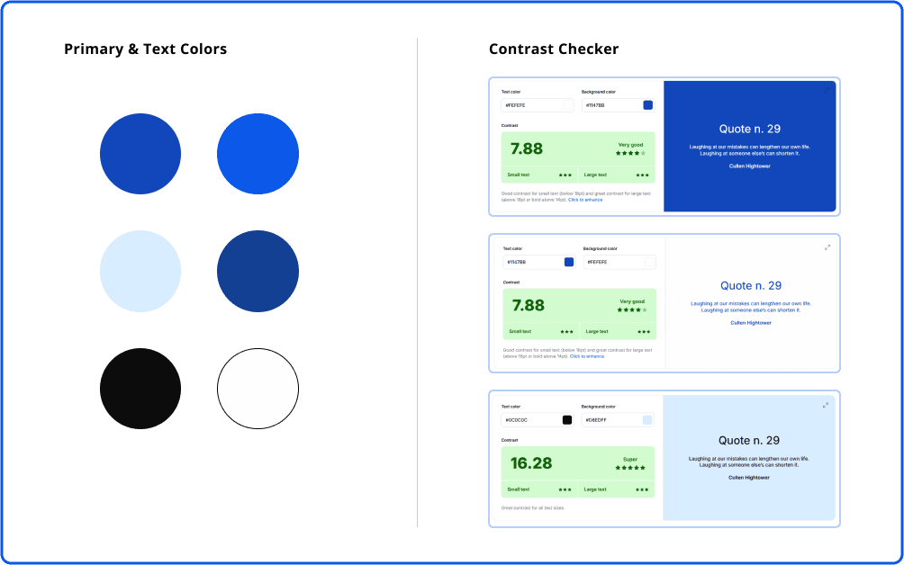 Originally, we chose orange and blue as the primary colors for WHC to represent compassion and trust. After several rounds of testing shades of orange, we couldn't get the colors to pass Web Content Accessibility Guidelines (WCAG) contrast checker. Ultimately, we made the decision to remove orange from the palette. This allowed us to prioritize accessibility while still maintaining a trustworthy and engaging design.