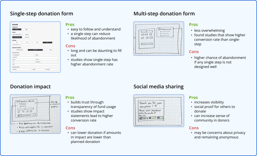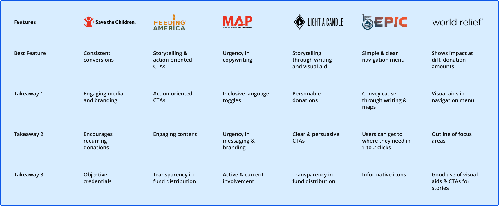 What could we learn from successful non-profit websites? We collaborated with UX Research to conduct a competitive analysis of 6 non-profit organizations. It revealed several key areas where these organizations exceled: