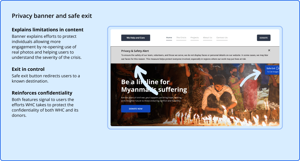 Protecting visitors Given the dangerous situation in Myanmar, visiting WHC’s website could be risky. We needed to make sure people felt safe and anonymous when they were on our site.