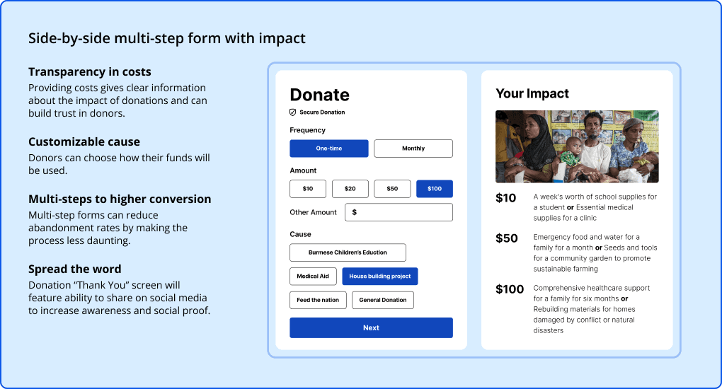 Even though we were using a third-party payment processor, we wanted to make sure our client had all the information they needed to choose the best one. We needed a payment solution that would provide seamless transactions and gave users control over how they donated.